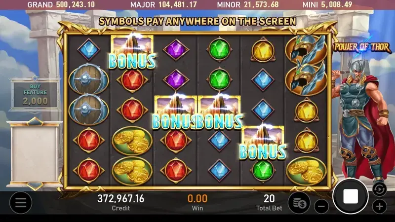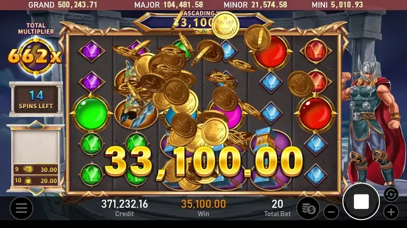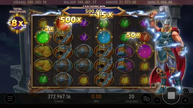 在遊戲中,當倍數符號出現時,神秘的力量將使贏得的分數隨機增加2倍到500倍。贏分組合可進行消除並可連續消除,直到無贏分組合為止,所有分數都會根據倍數符號再次翻倍。 當四個英靈殿免費遊戲符號出現時,將進入免費遊戲模式。在免費遊戲中,出現贏分組合的倍數符號將累積起來,直到免費遊戲結束為止。如此瘋狂的倍數贏分,使得財富迅速成長。----- Royal Slot Gaming RSG 娛樂城合作首選