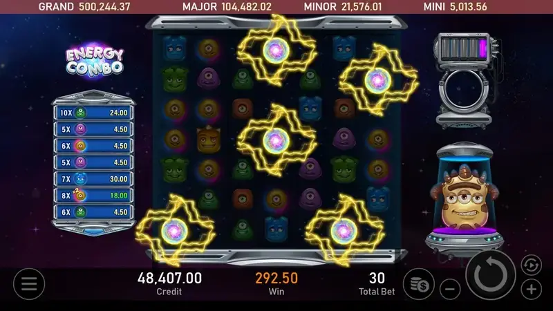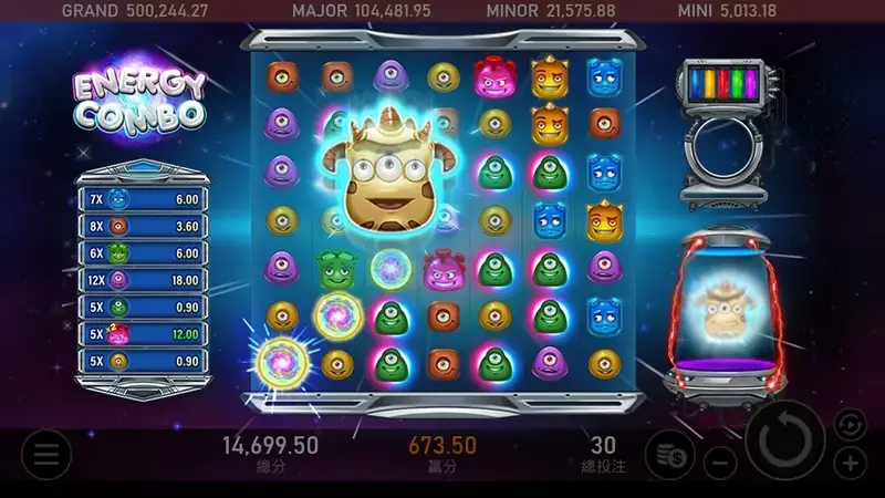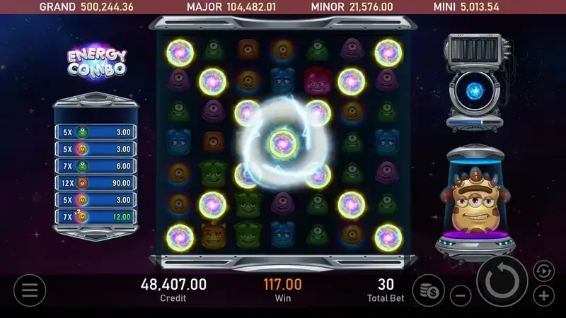 準備好與可愛的外星生物一起展開一場奇幻的連消冒險了嗎? 在遊戲中,每次消除的同時會為能量罐進行充能,每消除25個符號,即會隨機添加一種量子特色,當能量充滿到第5罐時,能量即將爆發,召喚出三眼外星人魔王,三眼外星人魔王是一個3x3的巨型百搭符號,他擁有強大的力量,能夠幫助玩家消除更多的符號並贏得大獎。----- Royal Slot Gaming RSG 娛樂城合作首選