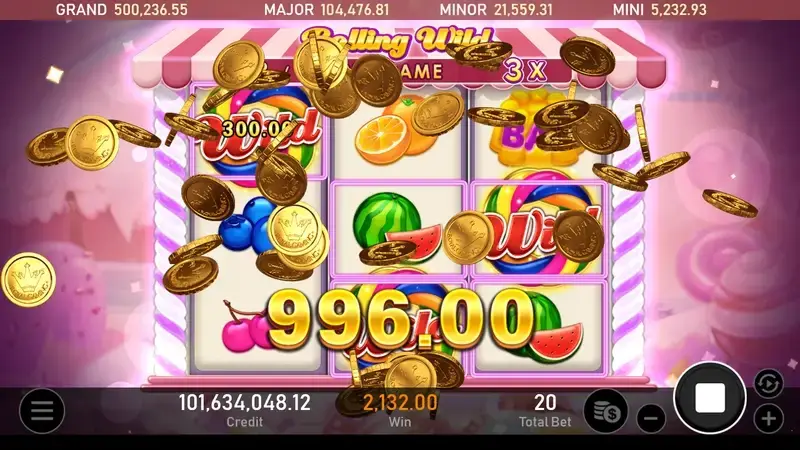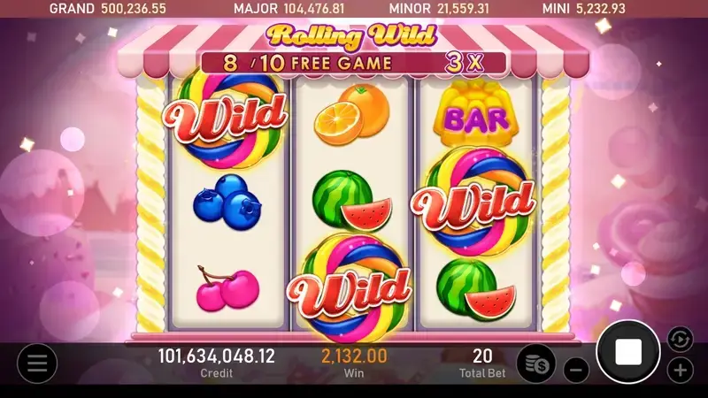 當糖果百搭符號降臨於第3轉輪時,將啟動免費遊戲模式,同時糖果百搭符號每局會向左滾動一軸。在免費遊戲期間,若第3轉輪再次降臨糖果百搭符號,將隨機贈送1或2次額外免費遊戲,最多可觸發9次。此外,每當再度出現糖果百搭符號,倍數將提升1倍,最高可達3倍。這一系列的精彩機制將為您的遊戲體驗增添更多刺激與樂趣,準備好享受這場充滿獎勵和倍數提升的甜蜜冒險吧!----- Royal Slot Gaming RSG 娛樂城合作首選